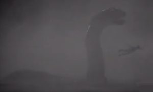 But something else featuring monsters happened in April of 1933. The movie King Kong was released in the first week of April, before the Spicer sighting and only a few days before the Aldie Mackay sighting. In addition to the giant gorilla King Kong, the movie featured dinosaurs, including a brontosaurus that attacks some people on a raft. Like the other monsters in King Kong, the brontosaurus was filmed using stop-motion animation, where a model is moved small increments, photographed, moved a little more, photographed again, and so on, so that when the photos are put together into a film, the model appears to move. This is how Wallace and Gromit is animated, and some old holiday specials like Rudolph the Red-Nosed Reindeer. It’s done well in King Kong, but the movements are a little jerky. To make the model look more realistic, the dinosaur was obscured by fog and trees in many scenes. It also emerges initially from the water and pursues the men onto land.