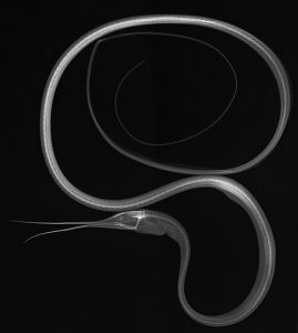 That’s the snipe eel, the name for a family of eels consisting of nine species known so far. They live in every ocean in the world, and some species are deep-sea animals but most live a little nearer the surface. The largest species can grow an estimated 5 feet long, or 1.5 meters, but because all species of snipe eel are so incredibly thin, even the longest individual weighs less than a football, either American or regular, take your pick.