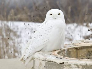 The snowy owl is mostly snow-white although young birds have black and gray markings. Its eyes are yellow and it often hunts in the daytime, but not always. Its wingspan can be as much as six feet across, or 1.8 meters.