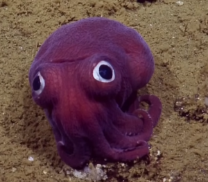 Next, Siya suggested the googly-eyed squid. Some people find squid and octopuses scary because they look so strange, but I admit I added this squid to the episode because I think its name is funny. It’s also called the stubby squid or the googly-eyed stubby squid. Its scientific name is Rossia pacifica, which gives you a hint that it lives in the northern Pacific Ocean. In the winter it likes shallow water without strong currents, but in summer it migrates to deeper water where it doesn’t get too warm.